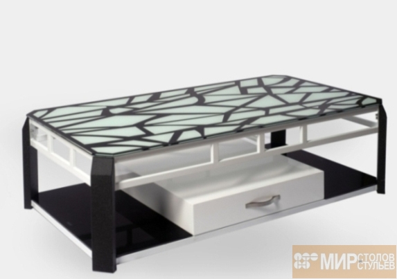 Размер: 130X70x45  см.  Калёное стекло 10 мм. (цвет черно-белый рисунок), рама - стальная белая, ножки - стальные черные, одна выдвижная полка.